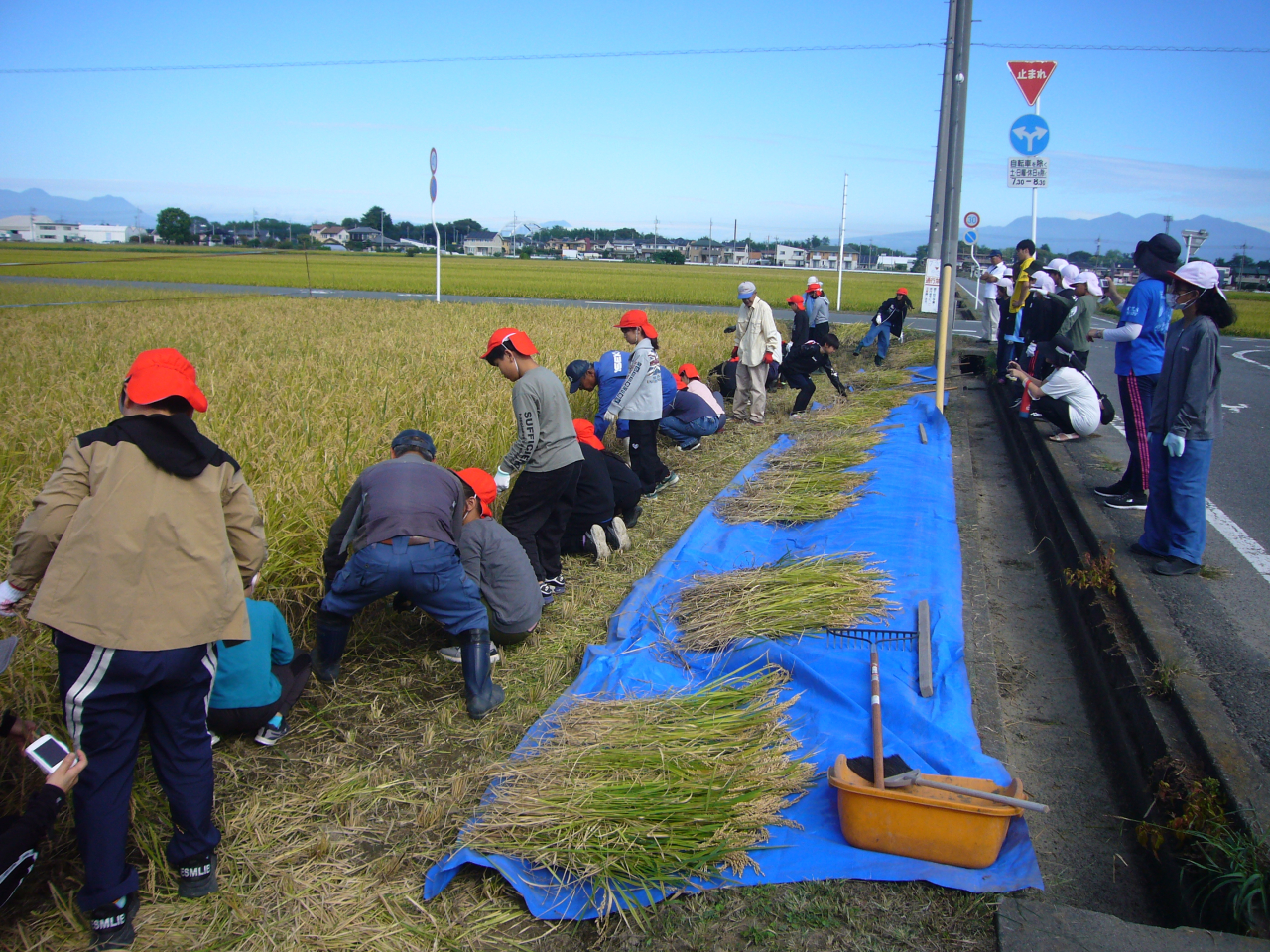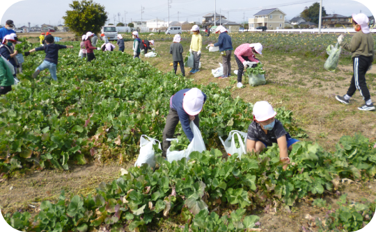 平成21年度より、遊休農地を借り受け、かき菜の栽培を始めました。当初は景観形成活動を目的としていましたが、食用にも使えることから、花が咲く前に摘み取ることに。摘み取ったかき菜は、給食センターに提供され、おひたしやごまあえとして学校給食で振る舞われています。 また、かき菜摘みは小学生の課外授業で扱われており、食育や地産地消の取組みを学ぶ体験学習として位置付けられています。 給食センターへの提供、課外授業が終了した後には、自由に摘み取ることができるようかき菜畑を開放し、地域の方々にも味わってもらっています。 また、訪れた方々には感想を書いてもらっており、大変美味しいと好評をいただいています。