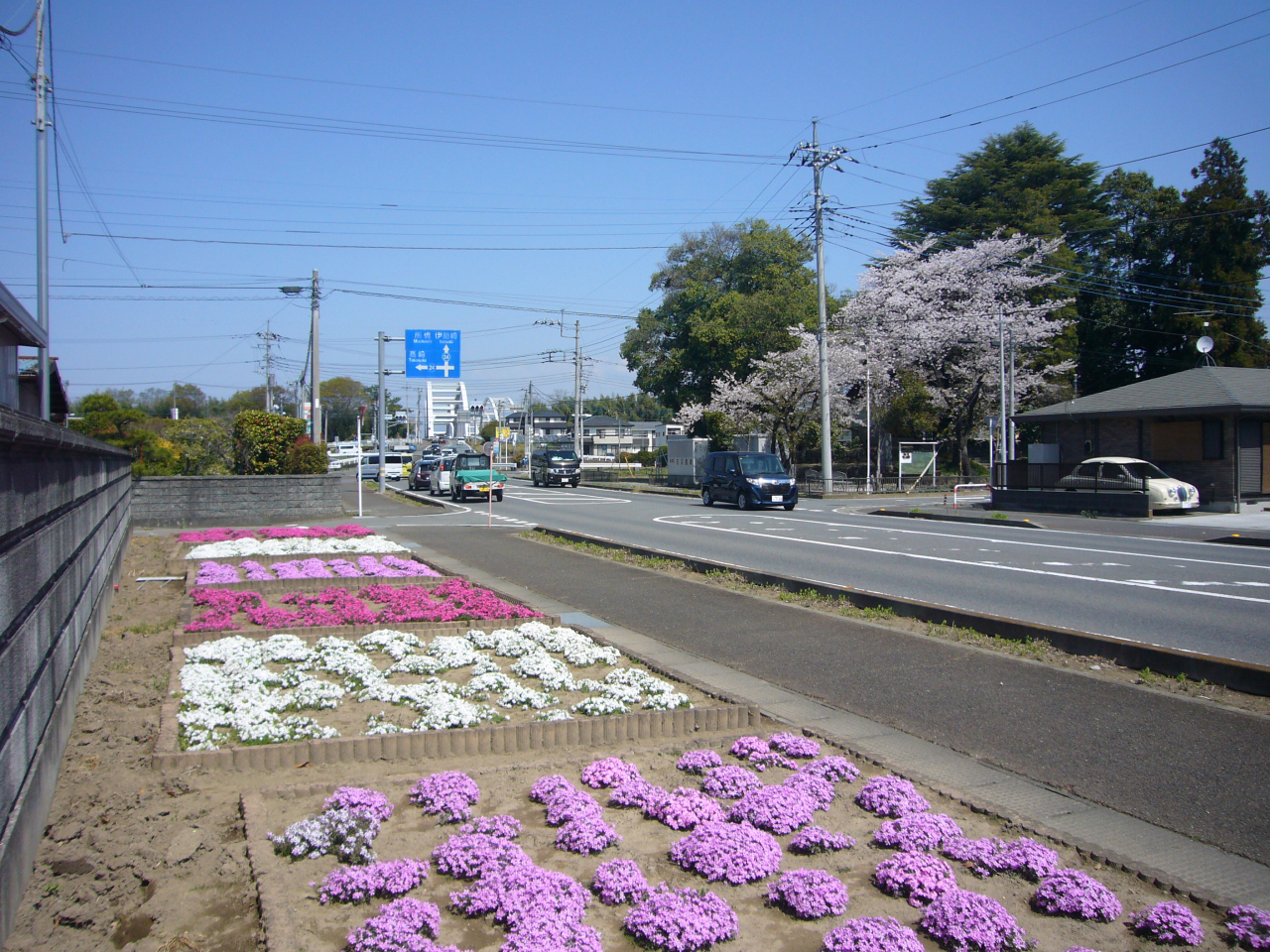 農道沿いに、芝桜の植栽をしています。植栽箇所の近くには染井吉野(ソメイヨシノ)が植えられており、春になると芝桜と染井吉野のコラボレーションが楽しめます。たくさんの地域の方々が花見に訪れるため、地域交流を図る場所にもなっています。