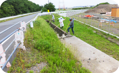 通水前に、構成員のみなさんと水路清掃を実施しました!吸水された雑草やゴミをすくいあげる作業は、本当に大変です…。 清掃をしていると、人為的に刈られた雑草や枝が流れてくることがあります。 こうした不法投棄は処罰の対象となる行為ですので、絶対にしないでください!