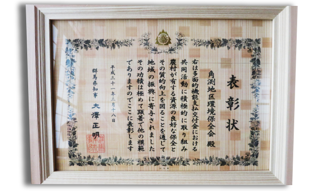 これまでの活動が評価され、平成31年3月18日に、群馬県庁・正庁の間で開催された平成30年度群馬県多面的機能支払優良活動表彰式において優良組織として、群馬県知事より、表彰されました。(群馬県水土里保全協議会HP)